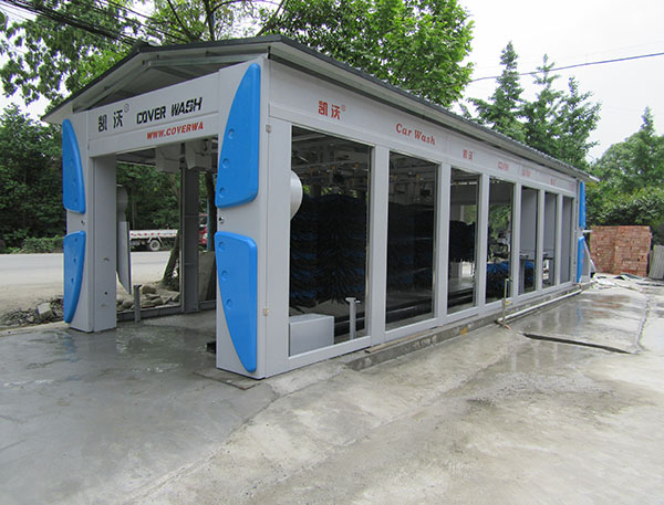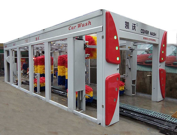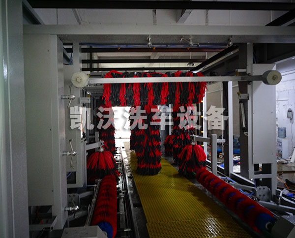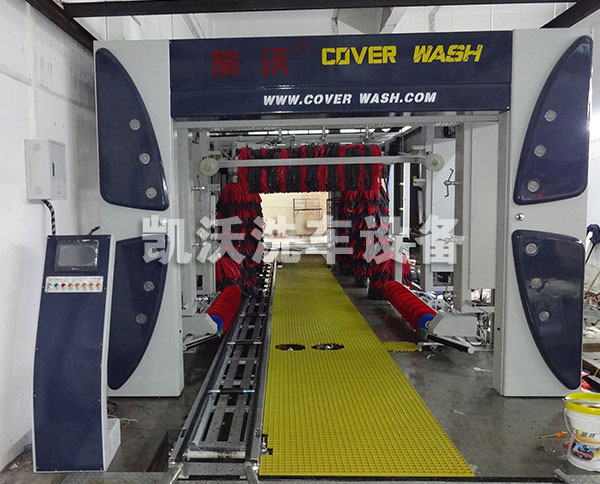凱沃隧道連續式電腦洗車機主要用于轎車、越野車、小型面包車、箱式等車輛的外表進行高壓水沖洗、清洗劑洗、刷洗、蠟洗、風干和拋光作業。當車輛被輸送機送入洗車房后,首先由擺動式高壓水刀完全沖掉附于車體上的微小砂礫及灰塵;再經噴淋發泡清洗液和多組洗車機專用刷滾對車輛表面及輪轂作多角度包裹清洗;經高壓風干后,再由三組特柔拋光刷作擦拭,使汽車表面更加光亮如新。