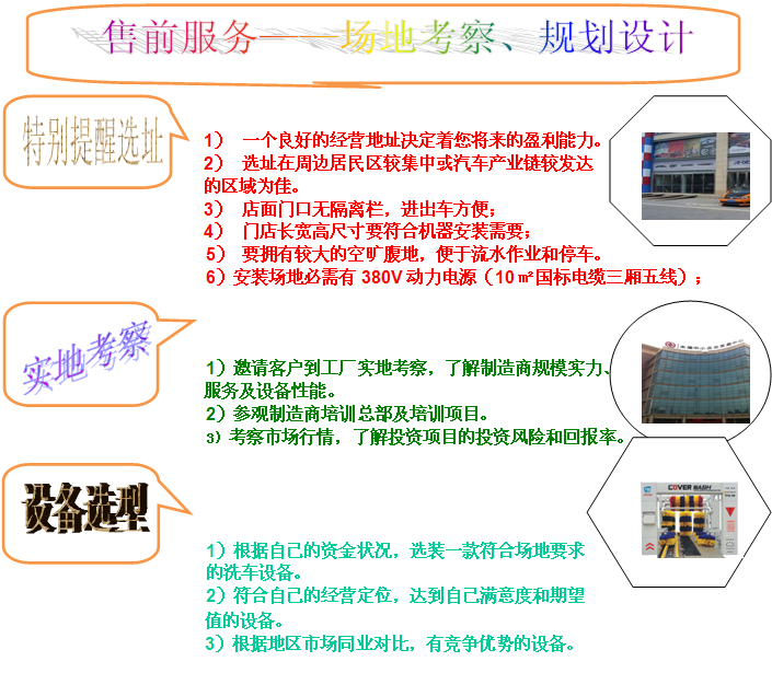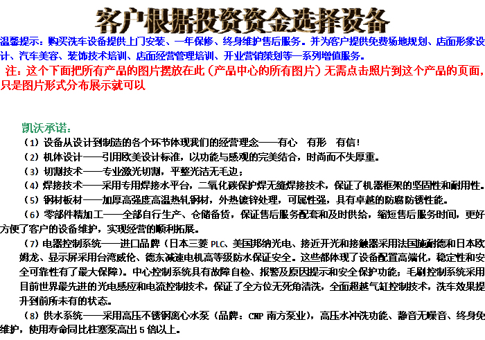 我公司產品規格齊全,高中低端設備應有盡有,總有一-款設備適合您免費費提供開店一 條龍指導及支持服務。投資定位選擇你所需需要的洗車機。我們誠邀您親自來我公司實地參觀考察!