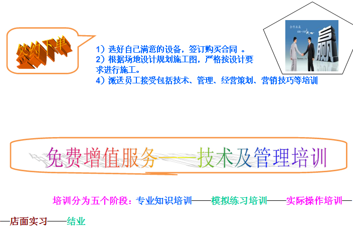 (1)我方向投資客戶提供招聘員工建議、免費技術培訓。店面運作架構、崗位配置、員工手冊等一系列人力資源要素支持。