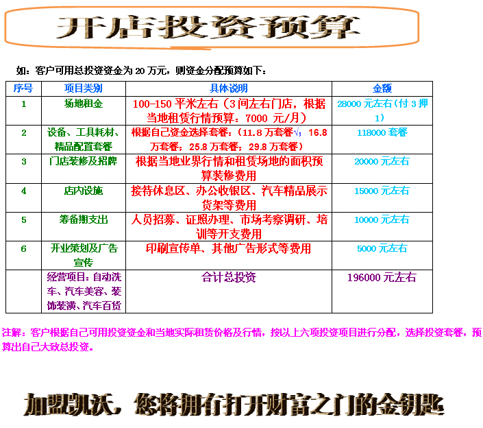 隨著汽車在中國市場的普及,汽車養護美容市場發展空間無限廣闊,會有更多的投資者加入到汽車養護美容服務市場的大軍中。對于新的投資者來說,進入一個陌生的領域,缺乏一整套完整系統的管理服務市場的模式,在短時間內占領市場幾乎是不可能的,所以對于新投資者和需要升級的養護美容店來說,全新的銷售合作支持模式應該是個捷徑。它能輕松獲得經市場驗證的成功經驗,短時間內實現信息流、物流、資金流的良性循環,加上精細的管理支持,達到快速占領市場的目的。